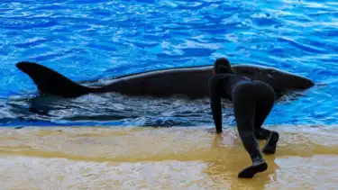 Di tengah atraksinya, sang pemandu tetiba jatuh akibat disundul paus pembunuh tersebut, sehingga muncul warna merah diduga darah dari dalam air.