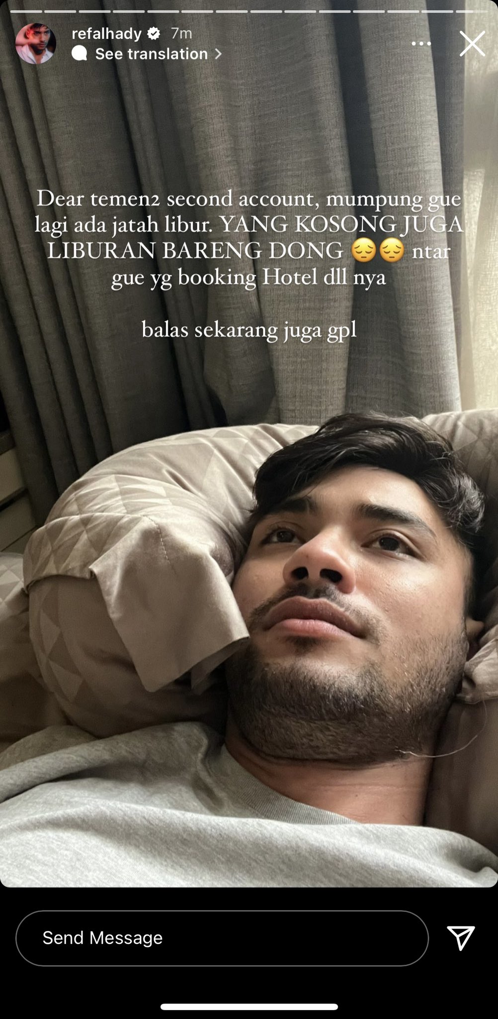 Itulah, Aktor Refal Hady salah posting di second account Instagramnya, mengajak liburan bareng melalui postingan story, bikin para netizen baper. (ind)