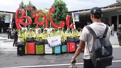 Saat berjalan menuju bus, Rizky melihat sekelompok ibu-ibu berbaris didepan ikon tulisan Bali untuk berfoto bersama.