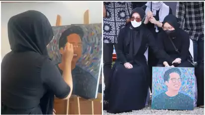 Ibunda Eril, Atalia Praratya membagikan unggahan foto dan video di akun instagram-nya, proses dibalik pembuatan lukisan potret Eril yang dibuat oleh anak keduanya Zara, dan menyita perhatian saat di tenteng di proses pemakaman Eril.