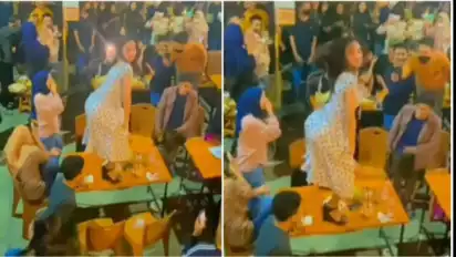 Video yang memperlihatkan seorang wanita yang diduga menari di atas meja tersebut tersebar luas di media sosial.