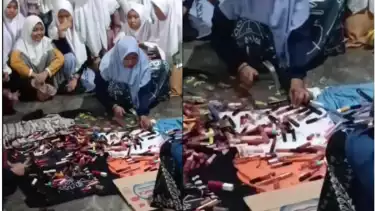 Dalam sebuah video yang diunggah akun Instagram @undercover.id pada Sabtu (16/7/2022), memperlihatkan para santriwati berkerumun menyaksikan para pengurus Pondok Pesantren yang sedang menggeprek lipstik atau lip cream mereka dengan palu.