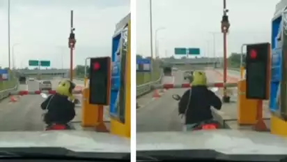 Ibu-ibu yang mengendari motor matik dan mengenakan helm kuning itu terlihat berhenti di depan gerbang tol dan kebingungan bagaimana caranya untuk melewati palang yang tertutup.