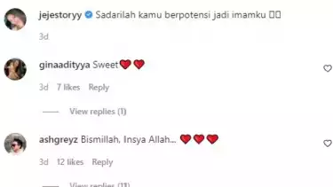 Sebab, Jeje menuliskan bahwa perempuan di sampingnya itu, yakni Abash alias Dian Ayu Ashari diharapkan bisa menjadi 'imam' Jeje di kemudian hari.