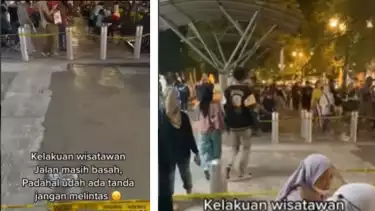 Pada video tersebut memperlihatakan sejumlah wisatawan yang dengan santai berjalan melintasi jalan yang baru dicor meski sudah terdapat tanda dilarang melintas seperti garis polisi pada kawasan tersebut.