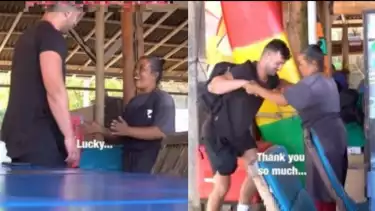 Sambil mencoba memijat kakinya seraya menawarkan minum kepada sang pria bule, tetapi sekali lagi sang pria bule yang mengenakan kaos berwarna hitam ini mengaku tidak memiliki uang untuk membeli minuman tersebut.