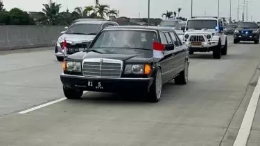 Sedan mewah klasik Mercedes-Benz S Class yang dibuat pada era 1980-an ini tengah berjalan melewati kerumunan. Mobil ini dikendarai oleh Ketua MPR Bambang Soesatyo dengan plat nomor kendaraan RI 5.