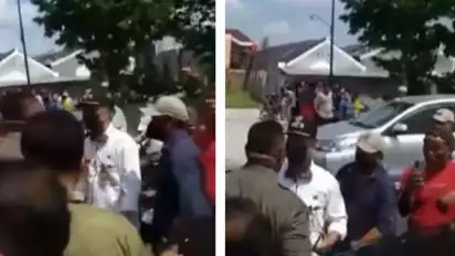 Pada video yang diunggah terlihat salah seorang pria berbadan besar menggunakan seragam satpol PP mencari pak lurah yang berada diantara kerumunan warga dengan nada tinggi.