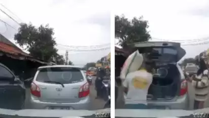 "Emak-emak diduga membeli beras tapi mobilnya diparkir di jalan sehingga menghambat laju kendaraan lain di belakangnya," tulis @terang_media pada keterangan video yang diunggah.