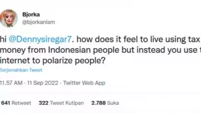 ¨hai @Dennysiregar7. Bagaimana rasanya hidup menggunakan uang pajak dari orang Indonesia tapi malah menggunakan internet untuk mempolarisasi orang?", tulis akun twitter @bjorkanism.