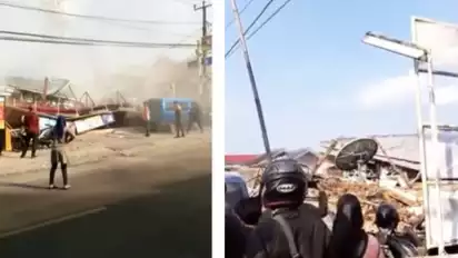Pada video tersebut terlihat sejumlah warga berkerumun di dekat sebuah bangunan minimarket yang ambruk mencoba untuk melihat kondisi pasca bangunan tersebut runtuh dan memeriksa terdapat korban atau tidak.