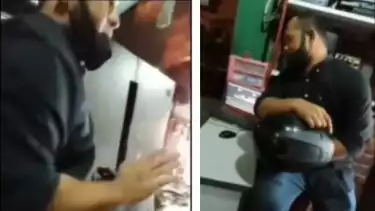 Pada video yang diunggah tersebut nampak seorang pria yang menggunakan kemeja berwarna hitam sambil membawa helm sedang berbincang dengan salah seorang pedagang di toko miliknya.