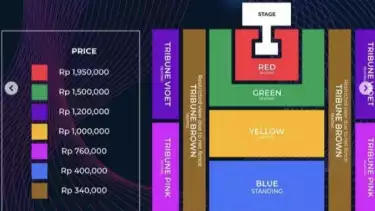 Sementara itu, terdapat juga Tribune Pink seharga Rp760 ribu serta Tribune Violet Rp1.200 ribu yang juga akan tersedia tempat duduk bagi penonton yang membeli kategori ini.