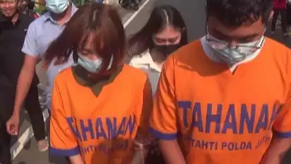 Ketika dibawa menuju ruang konferensi pers untuk ditunjukkan pada awak media, wanita kebaya merah dengan pasangannya nampak terus menundukkan kepala.