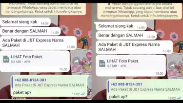 Si penipu berpura-pura mengantarkan paket dan mengirimkan lampiran file dengan format APK dengan nama “LIHAT FOTO Paket”.