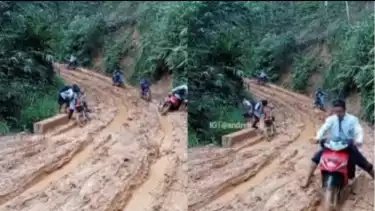 Mereka antre untuk memilih jalan yang lebih mudah untuk dilalui. Dalam video terlihat empat motor menunggu. Sementara temannya yang berjalan duluan terjebak di sisi kiri jalan. Motornya tampak susah untuk melewati lumpur tebal tersebut.