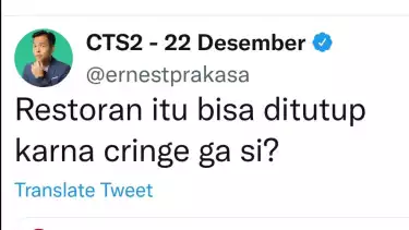 “Restoran itu bisa ditutup karena cringe ga sih?” Tulis Ernest Prakasa pada akun Twitter pribadinya.