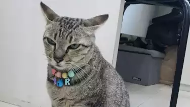 Terlihat sebuah foto dari seekor kucing betina berwarna abu-abu dengan corak garis-garis hitam menggunakan sebuah kalung dengan gantungan sebuah huruf K yang merupakan inisial namanya Kokom.