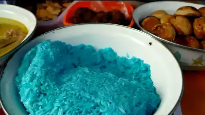 Sesuai namanya, ketan biru terbuat dari ketan yang dikukus hingga matang dan diberi pewarna makanan warna biru. Ketan tersebut dikudap dengan kelapa parut bercampur gula Jawa yang manis.