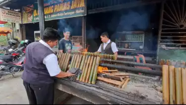 Untuk lemang bambu ini dijual dengan harga Rp35.000 per batangnya. Kedai Lomang Panas Jaya ini mampu menghabiskan 200 batang per harinya. (ayr/lno)