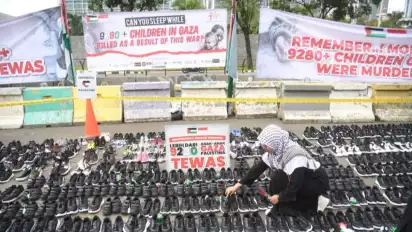 Mereka meneriakkan "Setop genosida" sekaligus mengecam kejahatan pembersihan etnis yang dilakukan Israel di Jalur Gaza.