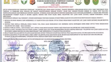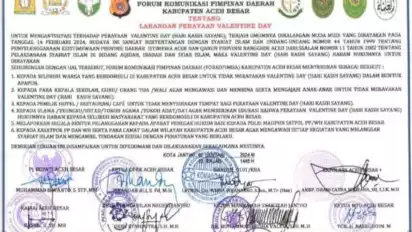 Pernyataan itu disampaikan menyusul telah diterbitkan seruan bersama Forkopimda Aceh Besar terkait larangan perayaan Valentine Day di kabupaten setempat. Seruan bersama tersebut ditandatangani unsur Forkopimda Plus Aceh Besar.