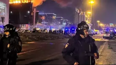 Pasukan keamanan berjaga di dekat Crocus City Hall, Krasnogorsk, Rusia