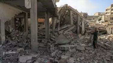 Warga Palestina memeriksa bangunan hancur setelah Israel serang di kota Rafah di Jalur Gaza selatan