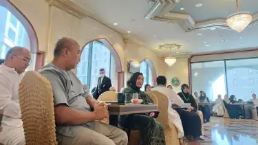 Jemaah calon haji Maktour dari Al Fath menyaksikan penjelasan pembimbing soal serangkaian kegiatan nanti yang akan dilakukan selama berada di Mekkah. Sumber: tvOnenews.com/Fauzie Pradita Abbas