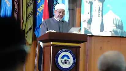 Hal ini ia sampaikan saat mengisi kuliah umum di UIN Jakarta. Grand Syekh Al Azhar Ahmed Al Tayeb melakukan kunjungan kali ketiga ke Indonesia.