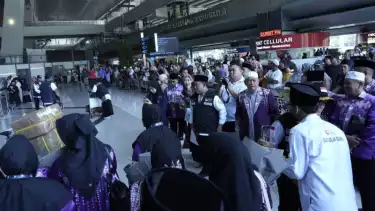 Tangerang, tvOnenews.com - Jemaah haji menyambut kedatangan para petugas yang tiba di Tanah Air.