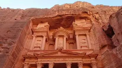 Petra dikenal dengan nama Kota Mawar karena diukir dari tebing bebatuan pasir berwarna kemerahan.