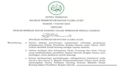 Bolehnya memilih kotak kosong tersebut tertuang dalam fatwa terbatas MPU Aceh Nomor 1 Tahun 2024 tentang Hukum Memilih Kotak Kosong dalam Pemilihan Kepala Daerah.