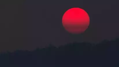 Cahaya Matahari yang dibiaskan atmosfer hanya menyisakan warna merah-oranye, sehingga penampakan Bulan terlihat dramatis memerah di langit malam.