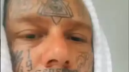 Pria bertato itu mempunyai tato di kening atau jidatnya dengan lambang Dajjal atau yang lebih identik dengan kelompok iluminati.