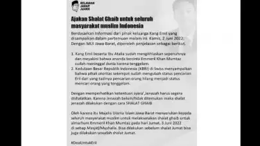 Jakarta - Majelis Ulama Indonesia (MUI) Provinsi Jawa Barat mengimbau kepada masyarakat muslim untuk menggelar salat gaib, hari ini Jumat (3/6/2022) untuk Emmeril Kahn Mumtadz (Eril) putra sulung Gubernur Jawa Barat Ridwan Kamil, yang hilang di Sungai Aare, Bern, Swiss.