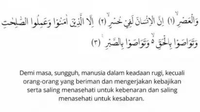 Semua manusia rugi, kecuali orang-orang yang beriman dengan sejati dan mengerjakan kebajikan sesuai ketentuan syariat dengan penuh keikhlasan, serta saling menasihati satu sama lain dengan baik dan bijaksana untuk memegang teguh kebenaran sebagaimana diajarkan oleh agama dan saling menasihati untuk kesabaran dalam melaksanakan kewajiban agama, menjauhi larangan, menghadapi musibah, dan menjalani kehidupan.