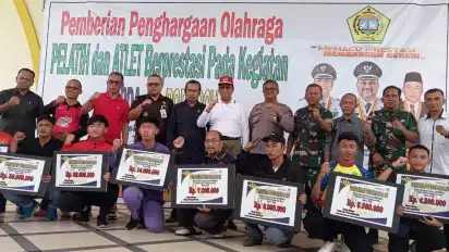 Karimun, tvOnenews.com - Pemerintah Daerah Kabupaten Karimun serahkan bonus kepada para atlet Karimun peraih medali di Pekan Olahraga Pelajar Daerah (Popda) dan Pekan Olahraga Provinsi (Porprov) Kepri tahun 2022 silam, dengan total keseluruhan bonus mencapai Rp735 Juta.