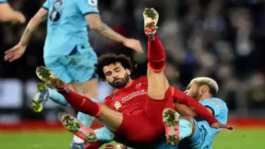 Pemain Liverpool Mohamed Salah berduel dengan pemain Newcastle United Joelinton