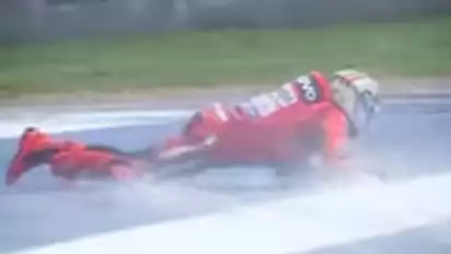 Nahas, pada ban belakang Marc Marquez tergelincir saat melewati tikungan 2, sehingga terlempar.