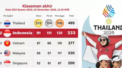 tvOnenews.com - Tim Indonesia resmi mengunci posisi runner-up pada klasemen akhir SEA Games 2025. Kepastian finis di peringkat kedua ini menjadi kabar membanggakan, terlebih diraih lewat perjuangan konsisten para atlet di berbagai cabang olahraga hingga hari terakhir pertandingan.