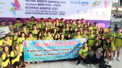 Jakarta, tvOnenews.com - Kontingen Jawa Timur berhasil keluar sebagai juara umum Kejuaraan Nasional Festival Akuatik Indonesia 2023 kolaborasi Bank BTN -PTPN.