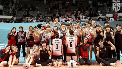 Kini Seungkwan pun ikut berpesta atas kemenangan Red Spark 3-0 (25-21, 25-23, 25-23). Dia bahkan melakukan foto tim lengkap dengan jersey Red Spark dengan namesetnya.