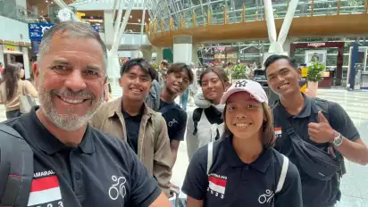 Bima Muslim Perdana dan kawan-kawan bertolak ke Malaysia didampingi pelatih Timnas Triathlon Indonesia asal Brasil, Cali Amaral.