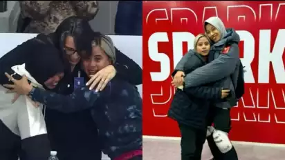 Ayuningtyas tampak berpelukan hangat di pinggir lapangan dengan ibunda Gia, merayakan kemenangan Red Sparks sekaligus memastikan lolos ke babak playoff.