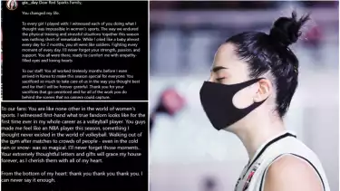 "Kepada setiap suadari yang bermain dengan saya: Saya menyaksikan Anda masing-masing melakukan apa yang saya pikir mustahil dalam olahraga wanita. Cara kami menjalani latihan fisik dan situasi stres bersama-sama musim ini sungguh luar biasa. Meskipun saya menangis seperti bayi hampir setiap hari selama 2 bulan, Anda semua seperti tentara. Berjuang setiap saat setiap hari. Saya tidak akan pernah melupakan kekuatan, semangat, dan dukungan Anda. Kalian semua ada di sana, siap menghibur saya dengan mata penuh empati dan hati penuh kasih," sambungnya.