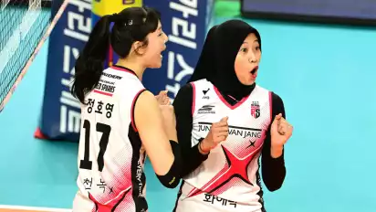 Namun Megawati Hangestri menjadi pusat perhatian dengan melakukan spike yang tersasar ke pemain IBK Altos, Choi Jeong-min.