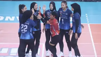 Yolla Yuliana Cs berhasil memenangkan laga setelah menaklukan Mitra Bank Jateng dengan skor 25-23 di set ketiga.