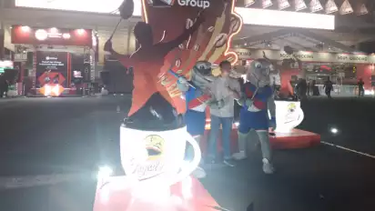 Hal yang tak terlewatkan adalah berfoto dengan sepasang maskot komodo yang masing-masing memegang raket badminton. Seluruh tubuhnya berwarna abu dengan memakai seragam biru bermotif bendera merah putih Indonesia.