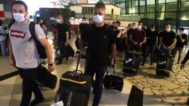 Sejumlah kru Formula E dari Tim Techeetah berjalan menuju bus yang akan membawanya ke hotel setibanya di Terminal 3 Bandara Soekarno Hatta, Tangerang, Banten, Selasa (31/5/2022).
